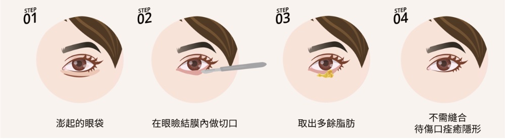 - 結膜內切口:從下眼結膜內部進行,外表不留疤痕。