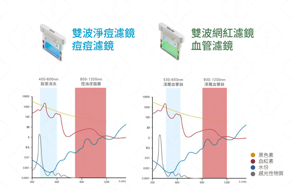 針對血管問題,另一個專利的雙波網紅濾鏡(血管濾鏡),則能夠使血管收縮,緩解敏感泛紅、微血管絲、酒糟、紅痘疤等問題。