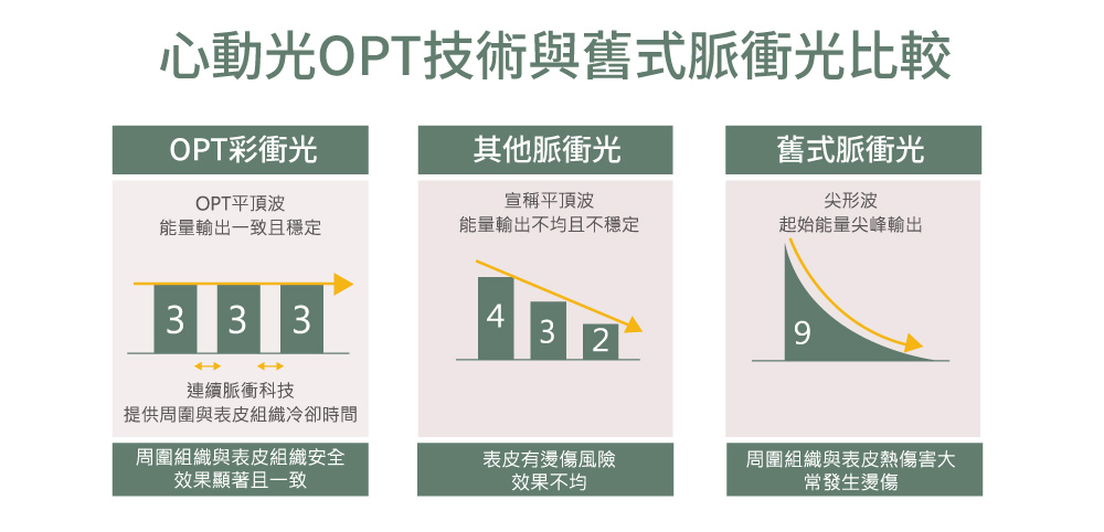 Stellar心動光主打「以光養膚」,搭載OPT專利脈衝技術,擁有9種專業濾片,透過不同的濾片組合,可同時向肌膚施打不同波段的光能,當光能被組織吸收後,會產生熱能,進而達到治療的效果。