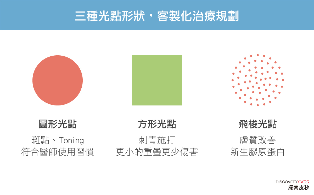 Discovery Pico探索皮秒雷射,通過美國FDA、歐盟CE及台灣衛福部等多國認證,擁有8種顏色的彩虹探頭,有圓形、方形及聚焦3種不同的形狀,醫師可以根據個人不同症狀需求、治療面積、深度去做選擇,只要更換探頭就能一次解決多種問題,例如532nm適用於淺層拋光、色素斑點的處理,694nm適用於深層斑點和亮白處理,1064nm則適用處理更深層的皮膚問題——治療深度可以更深、反黑機率低、更舒適滿意。