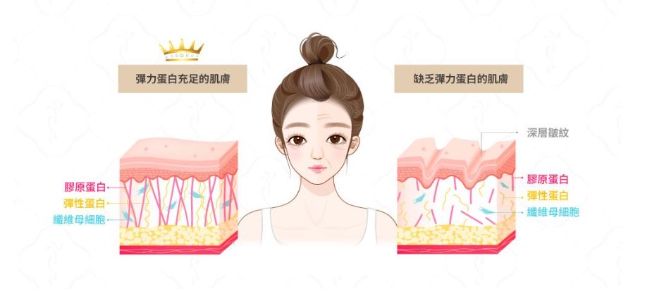 膠原蛋白(Collagen): 約佔真皮層的70%~80%,如同建築中的鋼筋結構, 支撐肌膚飽滿度與緊實度。隨年齡增長而流失,肌膚便容易出現凹陷與鬆弛。