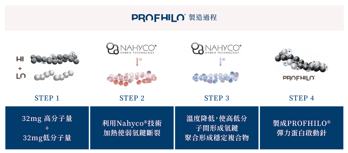 與其它常見的玻尿酸填充劑或膠原蛋白增生劑不同,PROFHILO逆時針屬於全新概念的「肌膚重塑劑」,透過專利NAHYCO®技術,結合高/低分子量玻尿酸(HMW/LMW HA),打造出極高濃度(每2ml含64mg)又穩定的HCCs協同複合體。
