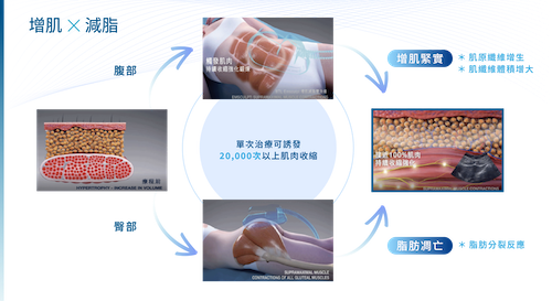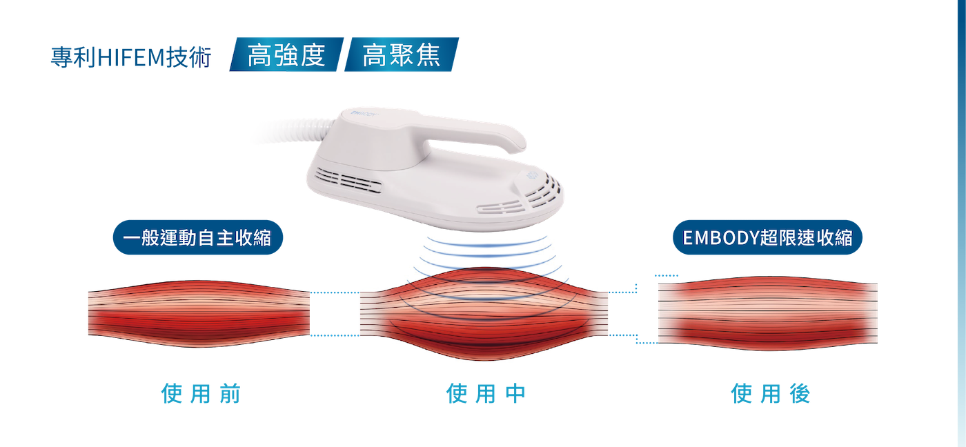使用專利 HIFEM(High-Intensity Focused Electromagnetic)高強度聚焦磁能技術肌動減脂,在短短 30 分鐘療程中誘發上萬次極限肌肉收縮,效果相當於高強度訓練,無須流汗、無恢復期,即可強化核心肌群、提升線條、促進代謝。