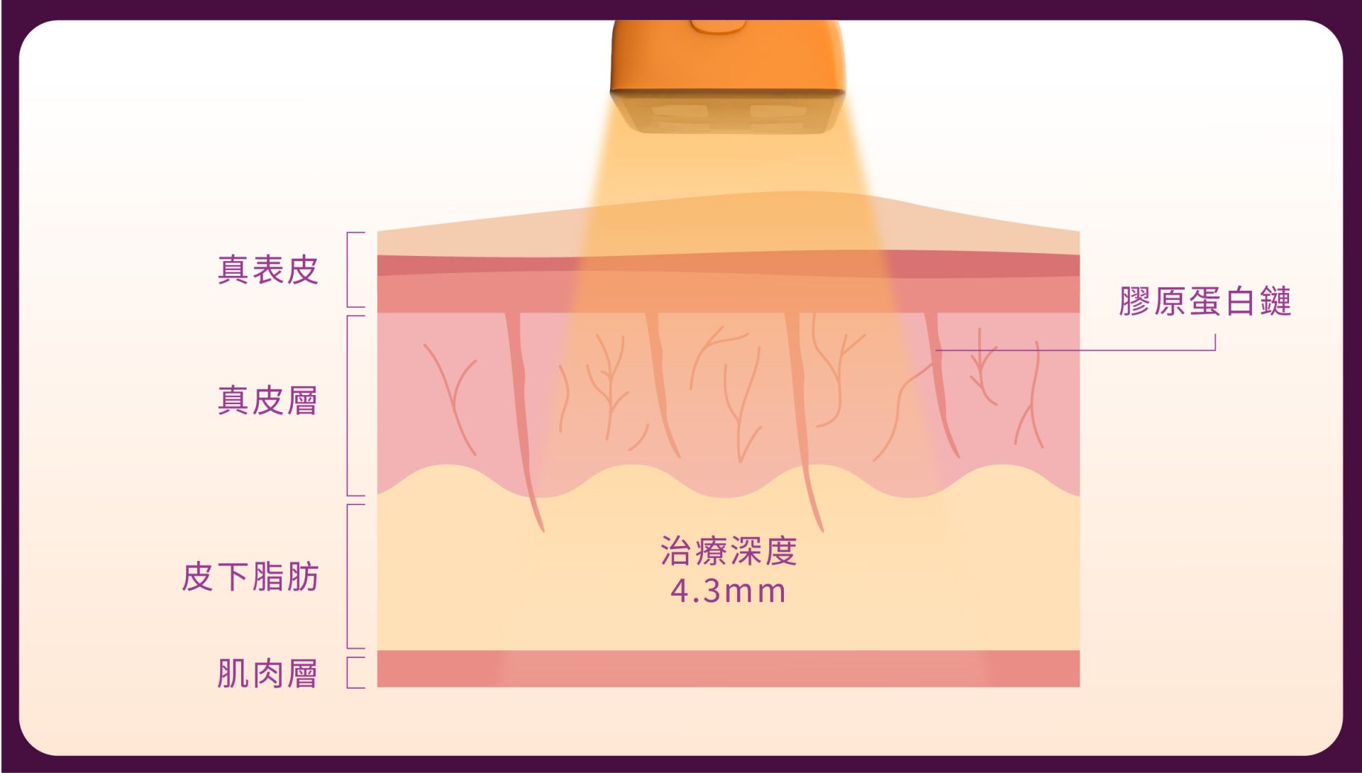 鳳凰電波 Thermage FLX® 專為身體設計的「美體黃金探頭」,搭配 AccuREP® 智慧能量優化技術,可將單極電波能量精準傳遞至皮膚深層,並採用 3D 立體容積式加熱方式,全面性的加熱每一層皮膚組織作用,深入直達 4.3mm 深入真皮層與皮下組織,幫助刺激膠原蛋白,實現緊實效果。