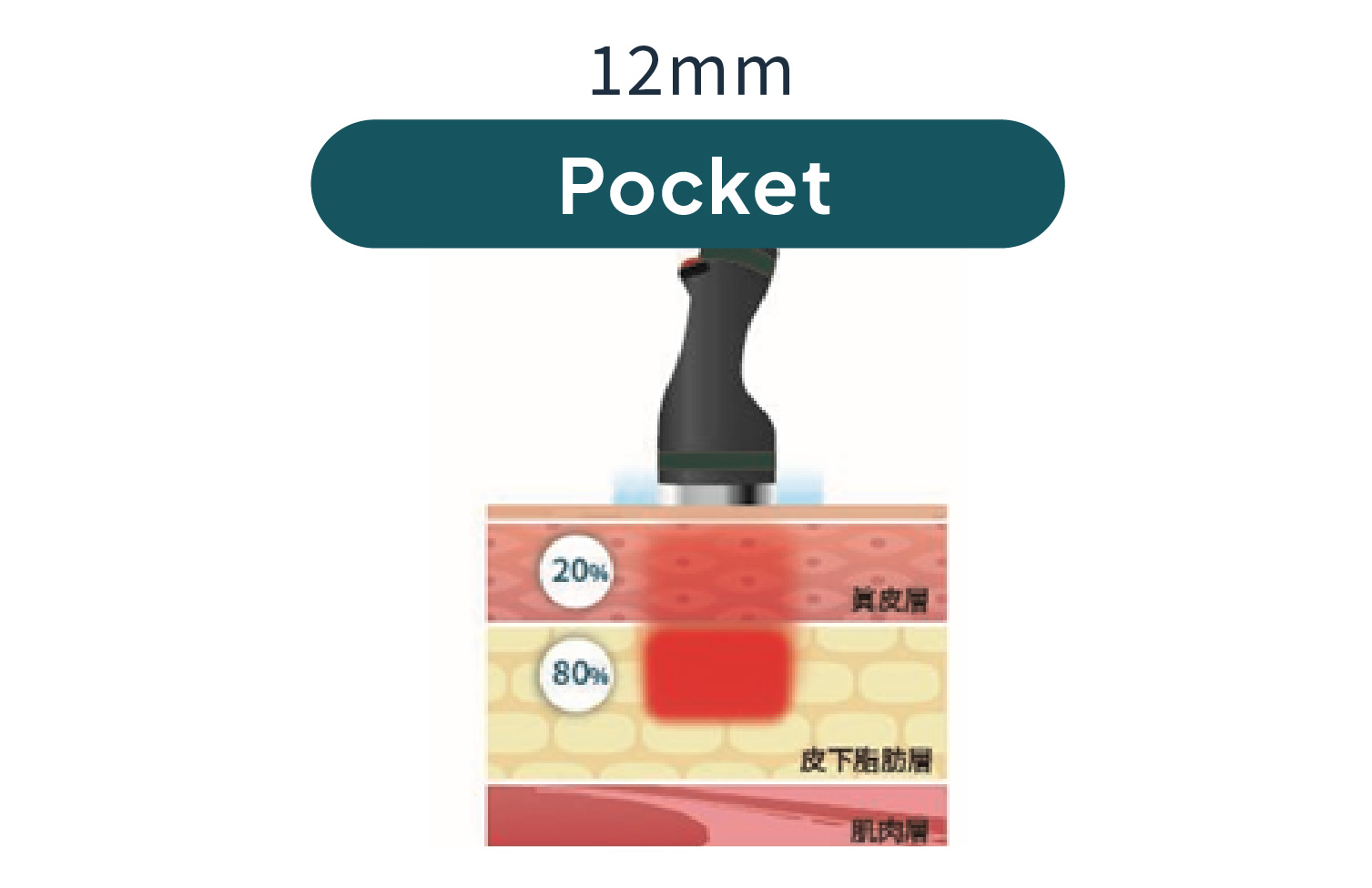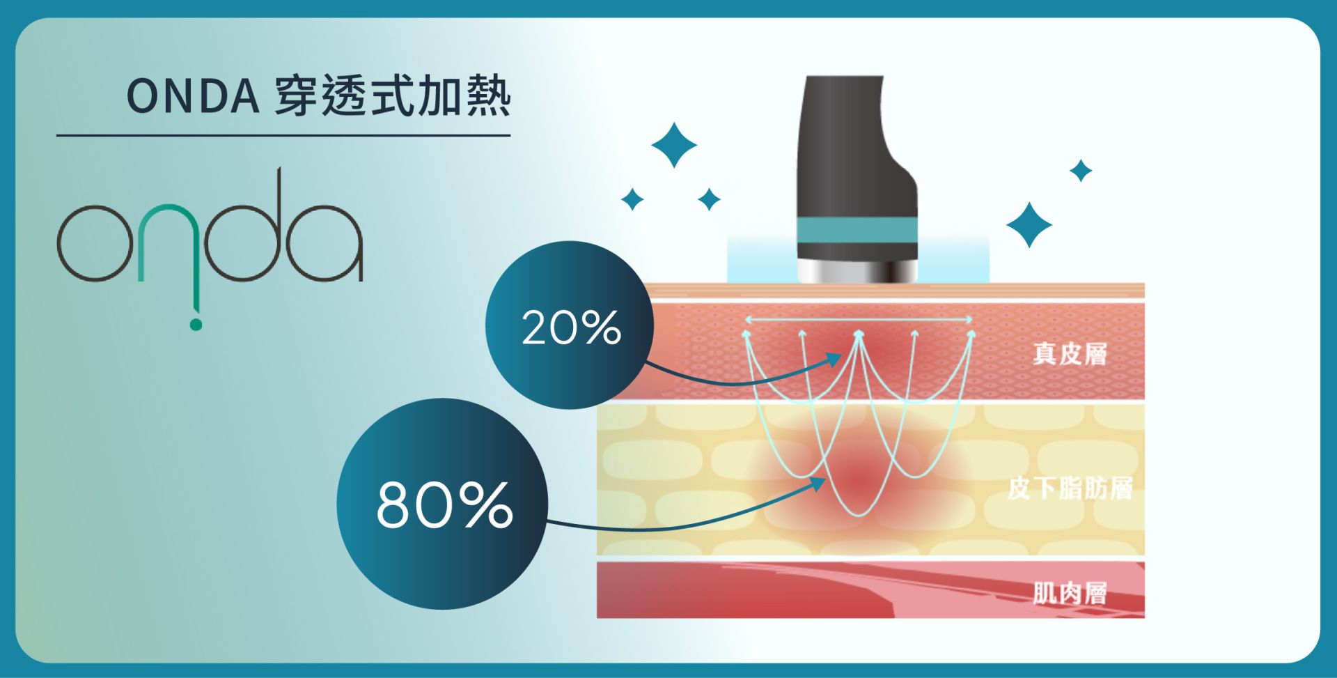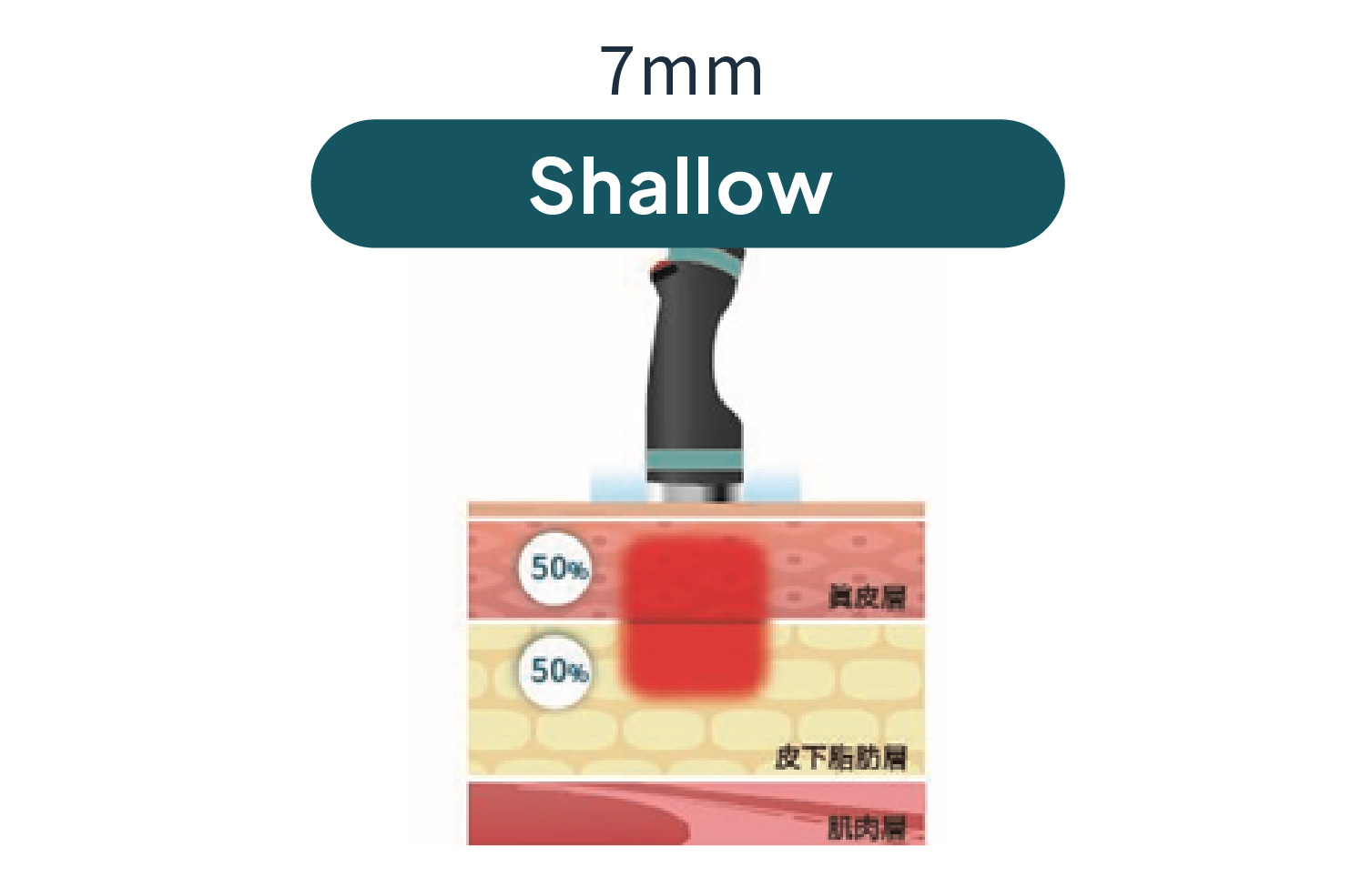 在約 0.7 公分深度的肌膚皮下進行穿透式加熱,熱能可深入達到真皮層及淺層脂肪區,實現熱能集中快速堆疊。適用於雙下巴以及深層面頰脂肪等區域。