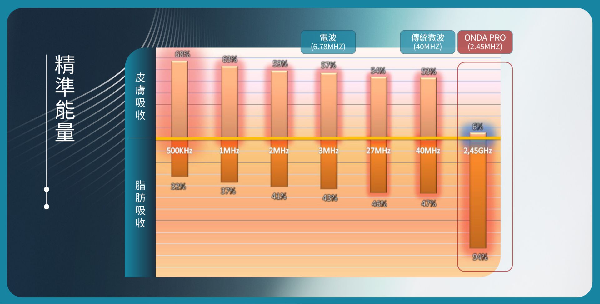 在身體肌膚約 1.2 公分深度,針對頑固脂肪與橘皮組織進行深層加熱,將多數熱能集中於深層,改善體態線條。
