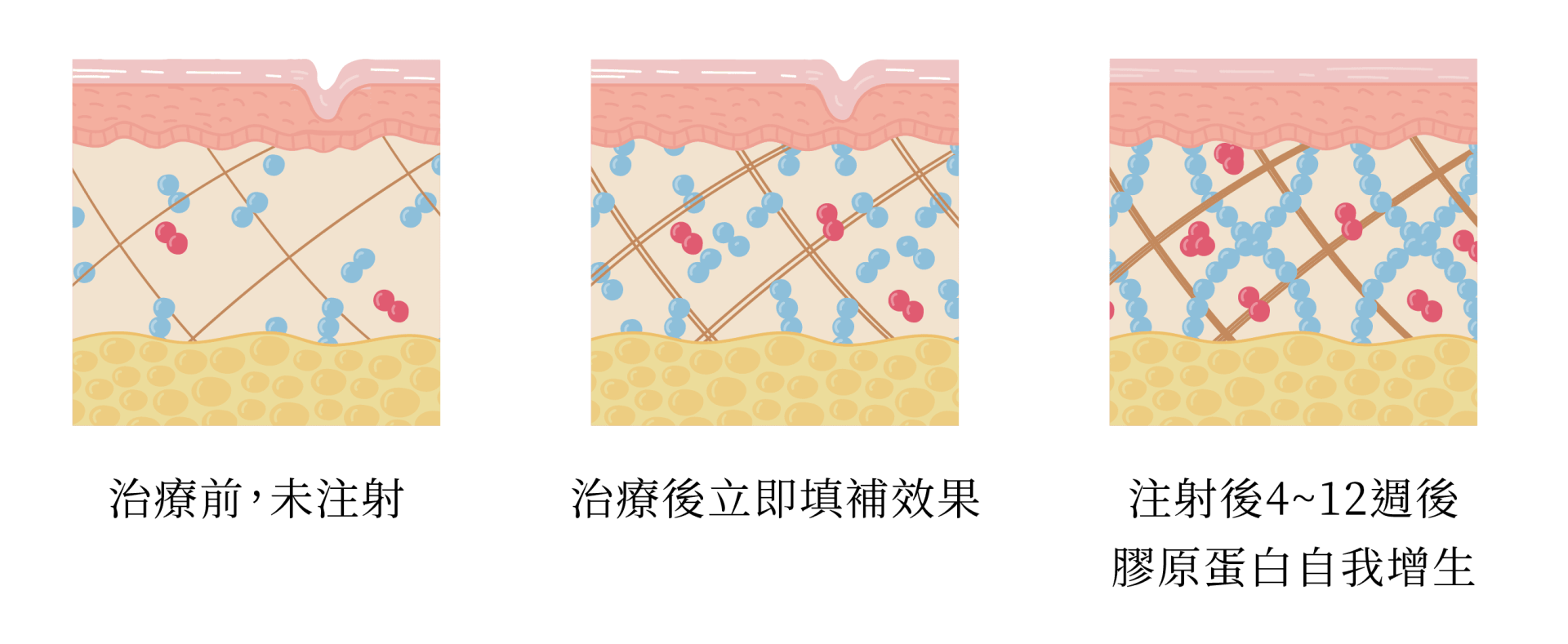 AestheFill艾麗斯注射後會先提供些微的立即填充效果,因此在療程初期(1~2週內)有短暫的澎潤感。 注射後約4至12週,PDLLA 微球逐漸被纖維母細胞包覆並活化,進而促進膠原蛋白新生(特別是第 I 型膠原),膠原蛋白生成的速度與程度會依個人體質、年齡及治療部位略有不同,通常建議搭配1~3次療程分段進行,以獲得更穩定與持久的修復效果。