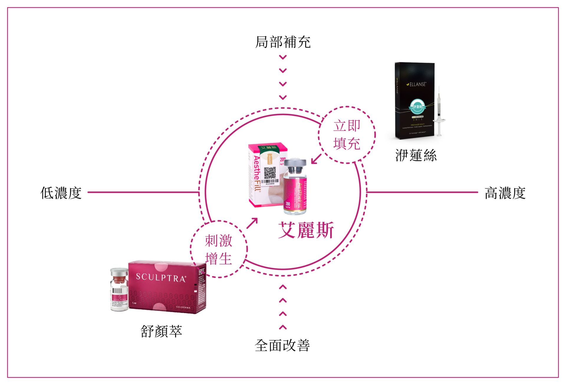 AestheFill®艾麗斯之所以被稱為「百變精靈針」,是因為可透過客製化的濃度調整,在維持高濃度、低稀釋時,立即填補皺紋凹陷處;而若是要針對大面積凹陷垂垮的部位,則可採取低濃度、高稀釋泡製法,長效持續地刺激膠原蛋白增生。