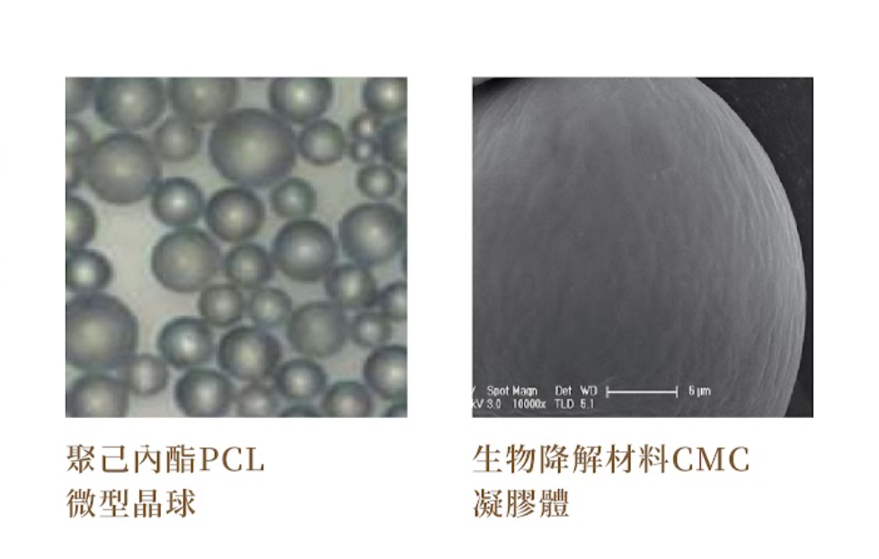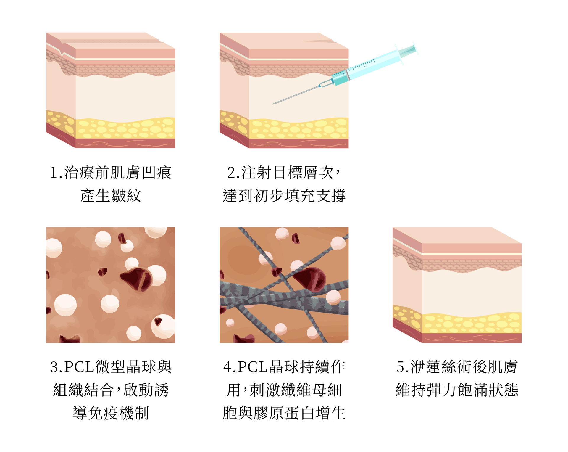 EllANSÉ洢蓮絲 PCL 微型晶球,是一種聚己內酯粒子,表面為平滑正圓型的微米球體,也是經 FDA 認證的安全聚合物。當 PCL 微型晶球注射進皮下肌膚後,會被組織均勻包覆並刺激纖維細胞,進而誘發自體膠原蛋白新生。
